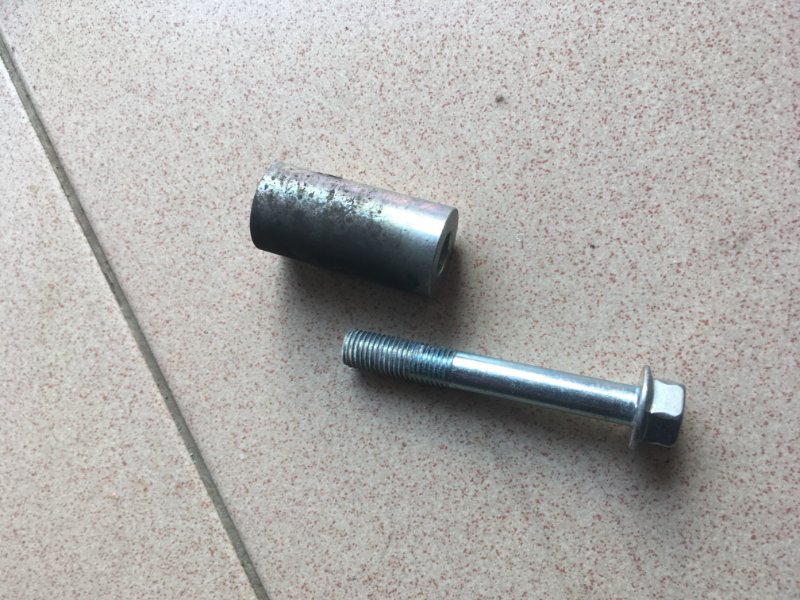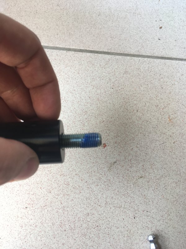 Une fois la vis enlevée d'un coté (procéder coté par coté), il faut réinstaller la nouvelle vis avec l'entretoise associée. Disposer du frein filet comme indiqué sur la photo ci-dessous: